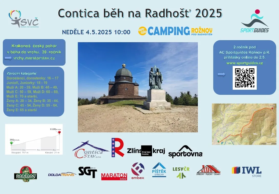 ROŽNOV POD RADHOŠTĚM - Klub AC Sportguides Rožnov p.R. uspořádal pod vedením Marka Tretery druhý ročník po 11 letech obnovený závod v běhu na Radhošť, pod názvem Contica běh na Radhošť. Závod byl opět zařazen do Českého poháru v běhu do vrchu. Na start se letos postavilo 108 běžců ve všech kategoriích dle pravidel českého poháru a také 12 turistů. To byla letošní novinka.